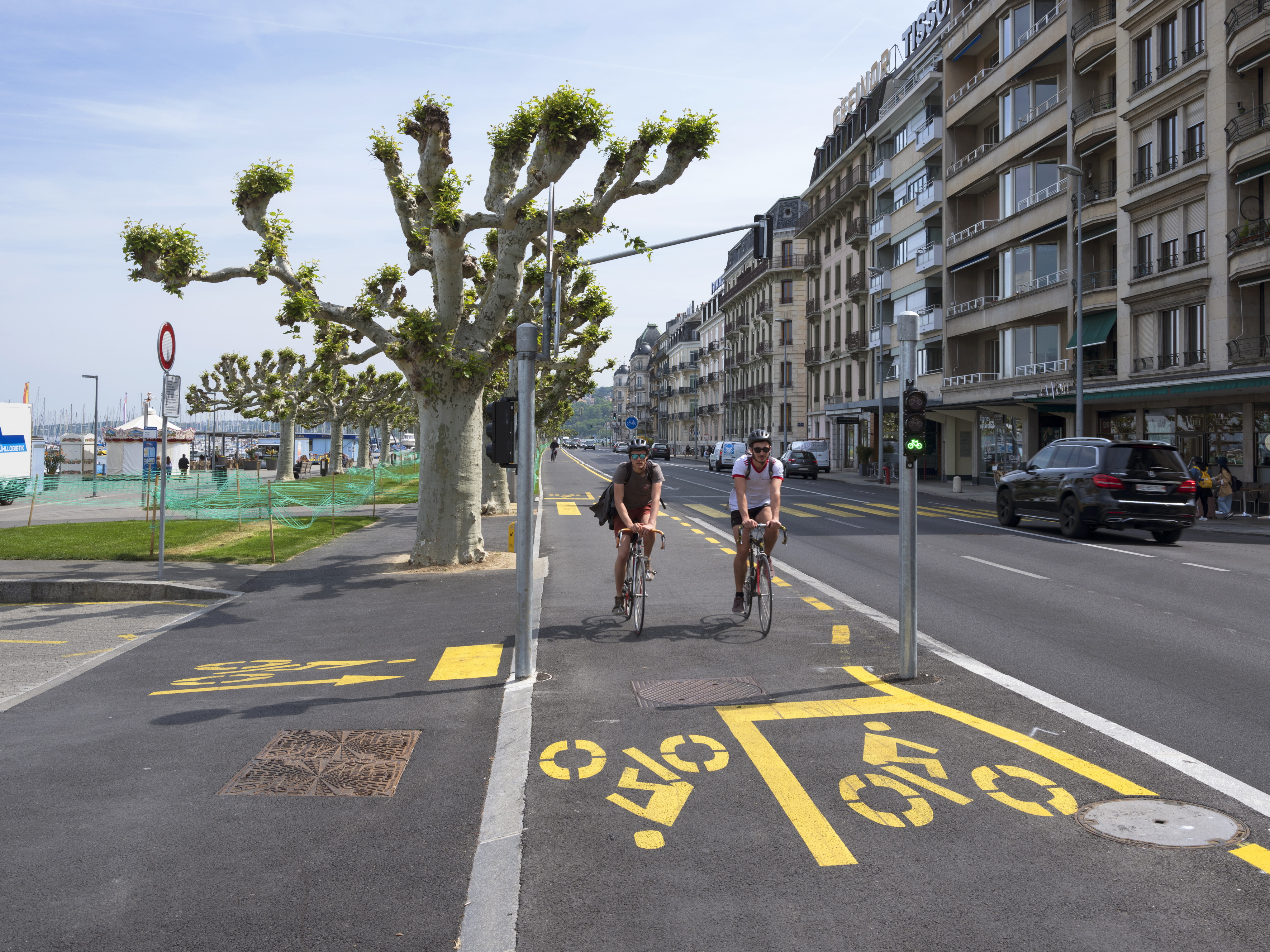 Die Stadt Genf holt Anerkennung für den 1 km langen Zweirichtungs-Radweg am Quai Gustave-Ador. Der drei Meter breite und baulich von der Fahrbahn abgetrennte Radweg verbindet das Zentrum mit dem neuen Strand Eaux-Vives. Eine solche Infrastruktur ist zwar aus nationaler Sicht nicht neu, für eine Stadt wie Genf mit ihrem besonders dichten Strassennetz und dem hohen Verkehrsaufkommen bedeutet sie jedoch ein enormer Fortschritt. Zudem ist sie von grosser strategischer Bedeutung für die Entwicklung des Veloverkehrs.