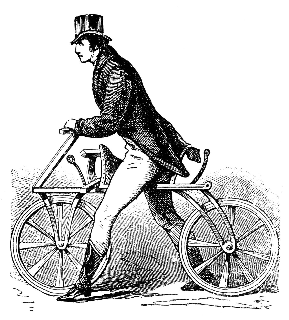 Der erste tatsächliche Vorläufer des Fahrrads war die „Draisine“, auch „Laufmaschine“ genannt, eine Erfindung von Karl Drais aus dem Jahre 1817. Das zweirädrige Holzgestell wurde durch das Abstossen mit den Füssen am Boden fortbewegt. Dank dem lenkbaren Vorderrad konnte das Gleichgewicht auch ohne Bodenkontakt der Füsse gehalten werden. So wurden mit diesem Vehikel bis zu 15 km/h erreicht.