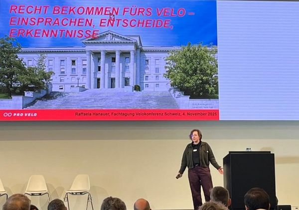 Schliesslich präsentierte Raffaela Hanauer, Projektleiterin «Veloweggesetz» bei Pro Velo Schweiz, eine brillante Analyse von rund zehn Gerichtsverfahren mit Velobezug - ein wichtiger Aspekt der Umsetzung des Veloweggesetzes für Fachleute und Regionalverbände von Pro Velo.