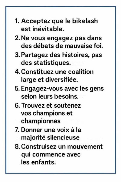 Le bikelash – retour du bâton contre le vélo malgré les progrès réalisés, a été l'un des sujets les plus discutés. Chris Bruntlett, de la Dutch Cycling Embassy, a présenté huit stratégies pour y faire face, rappelant que la résistance au changement reste vive, notamment chez certains commerçant·e·s ou citoyens opposés aux pistes cyclables.Ses explications.