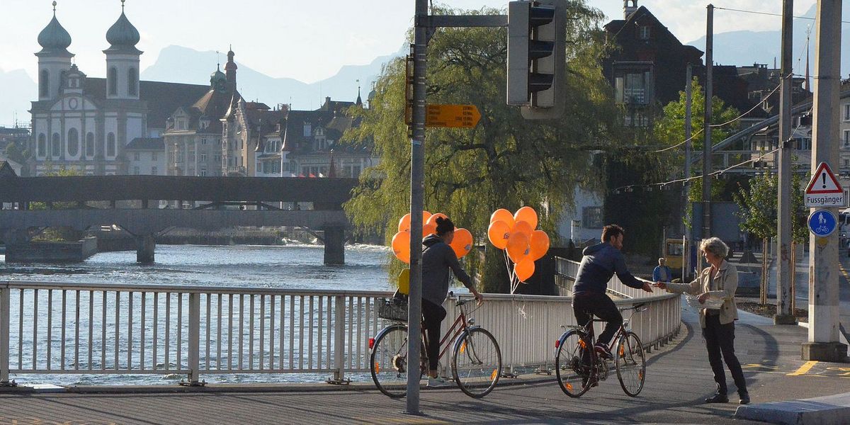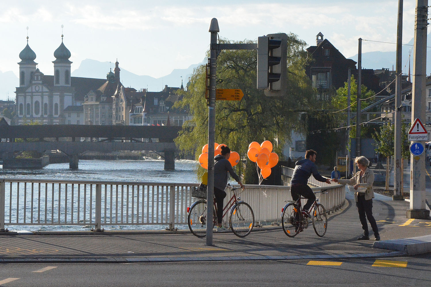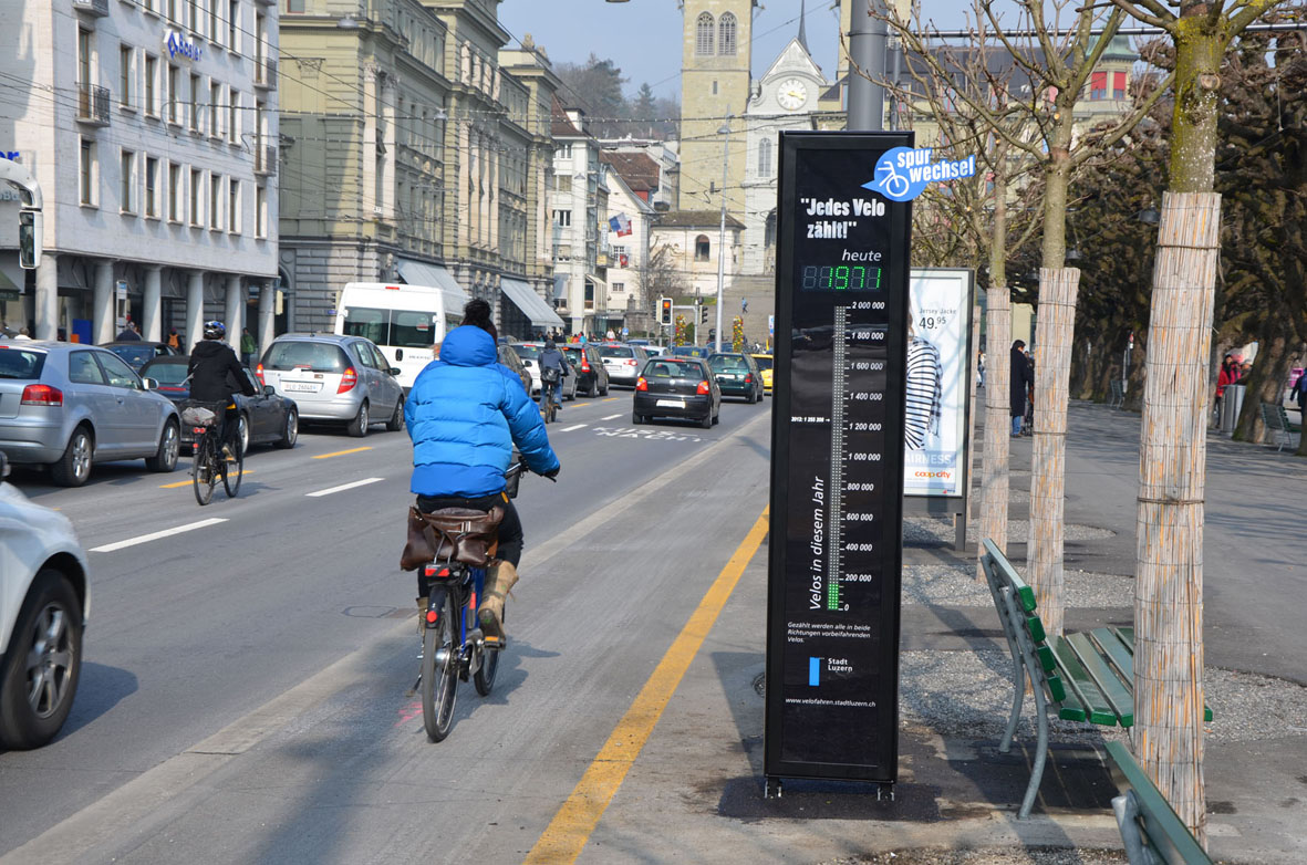 Avec l’adoption du « Réglement pour une mobilité urbaine durable », le peuple lucernois s’est prononcé en 2010 en faveur d’une planification de la mobilité et d’une répartition des parts modales plus efficace, avec la promotion du vélo en ligne de mire. Sous le slogan « Spurwechsel » (changement de voie, ou de vitesse…), la ville a entamé en 2012 une campagne pluriannuelle. Dans le domaine des infrastructures, les « trous » dans le réseau cyclable ont été comblés, les liaisons existantes sécurisées, des adaptations favorables aux cyclistes aux feux de circulation, et enfin une nouvelle vélostation de 1'100 places avec accès direct aux quais a été ouverte à la gare. Ces réalisations ne sont toutefois pas suffisantes pour créer une vraie culture du vélo. La ville a donc mis en place de nombreux services : des pages internet complètes autour du vélo ont été créées, des pompes à vélo publiques installées aux endroits passants, ou encore la mise à disposition d’une offre de nettoyage au sein de la vélostation. A dix emplacements, des « baromètres vélos » ont été installés : ils renseignent tous les usagers sur le nombre de cyclistes passés par là le jour même et durant l’année en cours. Ils fournissent également des informations précieuses sur l’évolution du trafic cycliste aux planificateurs, notamment en vue des nouveaux aménagements à planifier. Enfin, last but not least, une importance particulière a été accordée au travail de sensibilisation : des affiches mobiles avec des slogans sans cesse renouvelés, des festivités et journées d'action ou encore la distribution de douceurs aux cyclistes. Le système de vélos en libre service a également été mis en avant. Enfin, une sensibilisation aux préoccupations des cyclistes au sein de l’administration vient encore compléter ce volet.