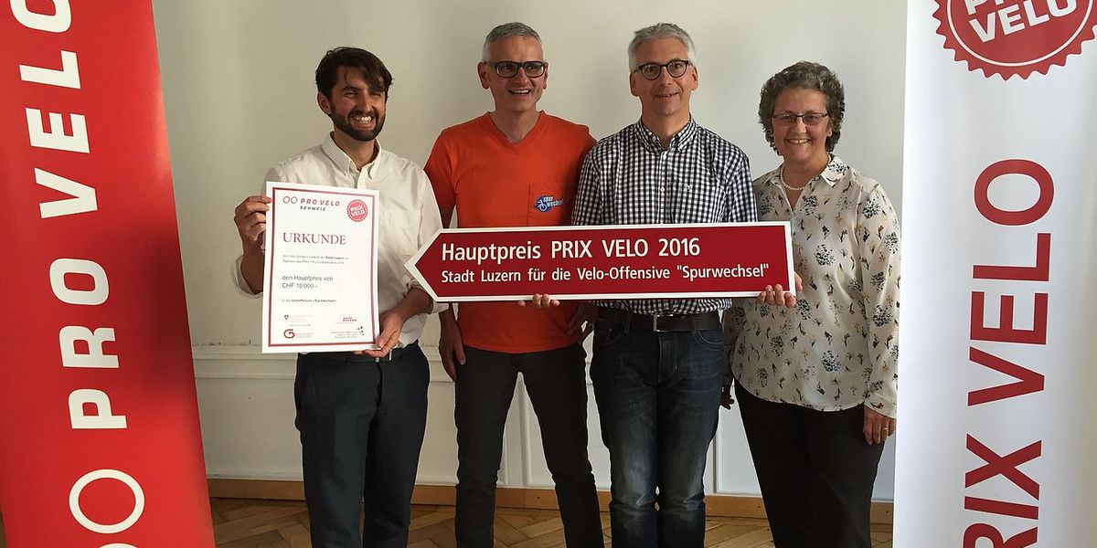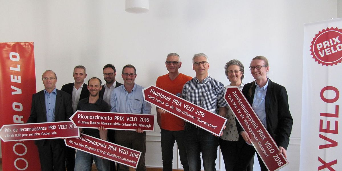 Pour la cinquième fois, le PRIX VELO Infrastructure récompense des infrastructures ou projets d’avenir pour les cyclistes. 39 projets ont postulé, ce qui correspond à un doublement du nombre de candidatures par rapport à la dernière édition. La ville de Lucerne a remporté le prix principal doté de CHF 10'000.-, grâce à son offensive vélo « Spurwechsel ». Des prix de reconnaissance vont à la ville de Bulle pour un « plan d’action vélo », au canton du Tessin pour un itinéraire cyclable dans le Val Maggia, à la ville de Berne pour une « autoroute vélo » entre la gare et le quartier du Wankdorf, et enfin à la société Flims Laax Falera qui a développé un concept touristique global de mobilité douce.