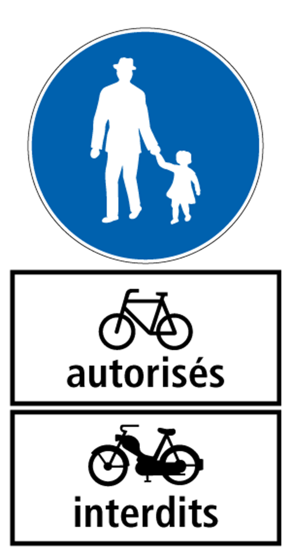 Les chemins pour piétons signalisés en bleu et les trottoirs non signalisés ne peuvent pas être empruntés par les vélos, les vélos électriques et les cyclomoteurs.