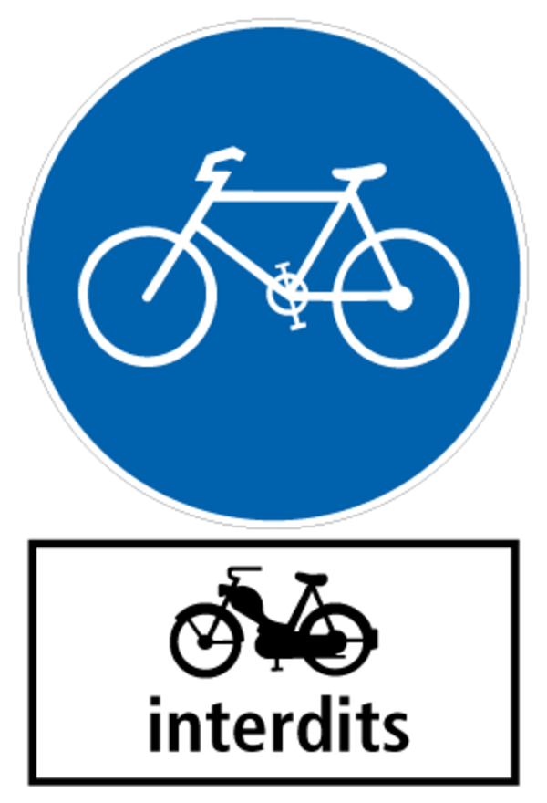 Lorsque la plaque complémentaire «Cyclomoteur interdit» est présente, la circulation sur les pistes cyclables est interdite aux vélos électriques rapides et lourds ainsi qu’aux cyclomoteurs à essence. Ce panneau complémentaire peut aussi être placé sous les signaux «piste cyclable et chemin pour piétons» - séparés ou non.