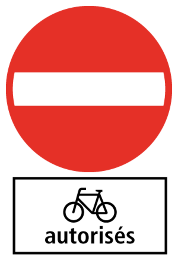 Le signal «accès interdit» s’applique à tous les véhicules. Avec la plaque complémentaire «vélo autorisé», le passage est autorisé pour tous les vélos, vélos électriques et cyclomoteurs, même avec le moteur allumé.
