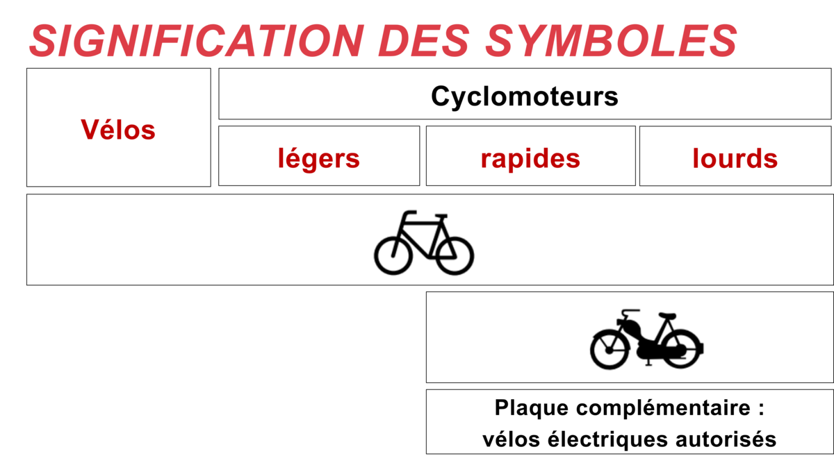 Le symbole du vélo s’applique à tous les vélos et vélos électriques; le symbole du cyclomoteur s’applique à tous les cyclomoteurs «rapides» et «lourds», c’est-à-dire les vélos électriques 45, les cyclomoteurs à essence et les vélos-cargos lourds. En outre, les autorités peuvent utiliser le panneau «vélos électriques autorisés».